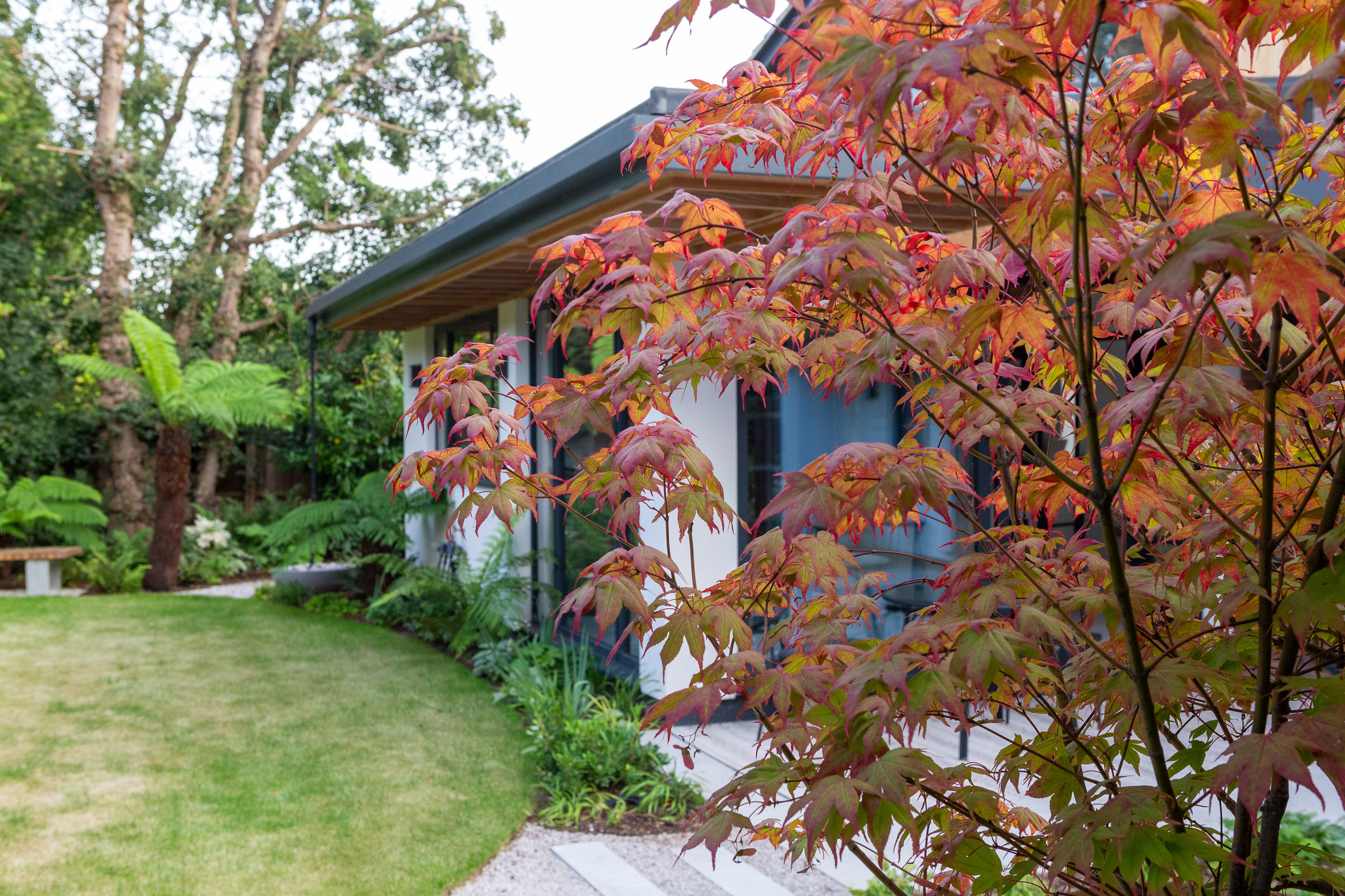 Trees bring natural rhythm to a garden. Spring blossom, deep green summer foliage, and rich autumn colour from species like rowan and liquidambar ensure constant visual change. In winter, architectural branches and textured bark from trees like silver birch add definition when planting elsewhere is dormant.