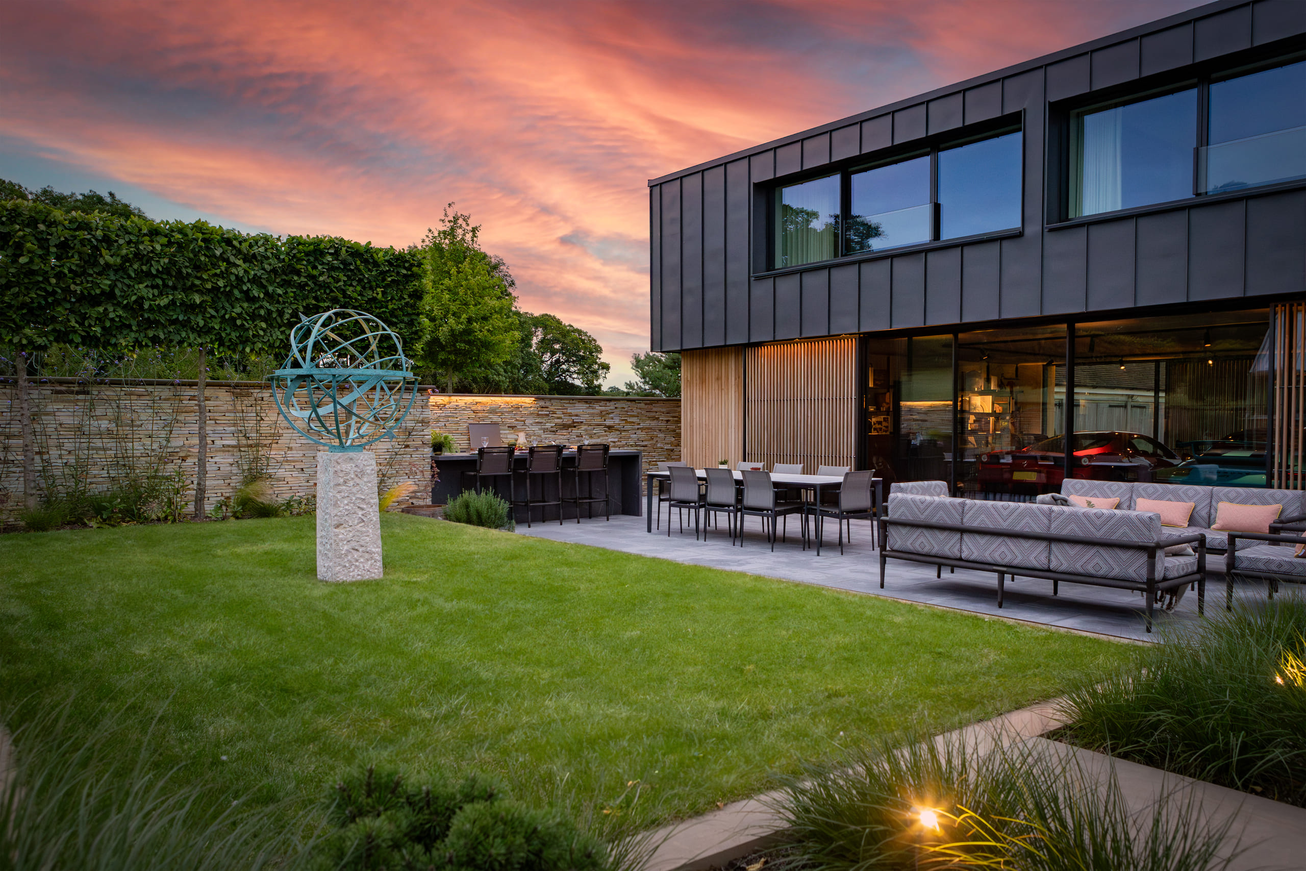 At the heart of the garden, an Armillary Sphere sculpture from David Harber creates a timeless and sophisticated focal point.