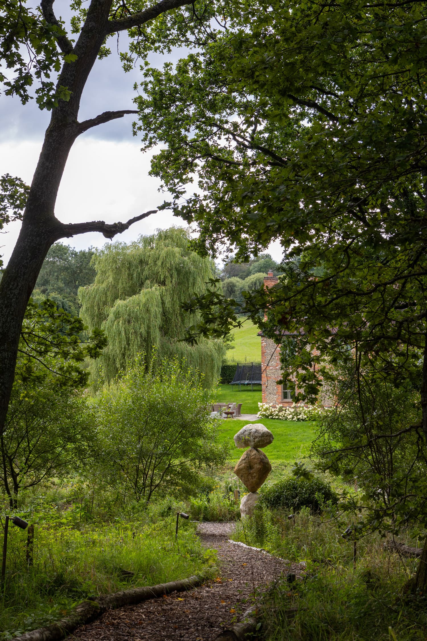 A beautifully balanced stone sculpture invites you to explore further into the woodland, whilst locally sourced boulders line the brook – uniting the manicured garden with the wilder woodlands.