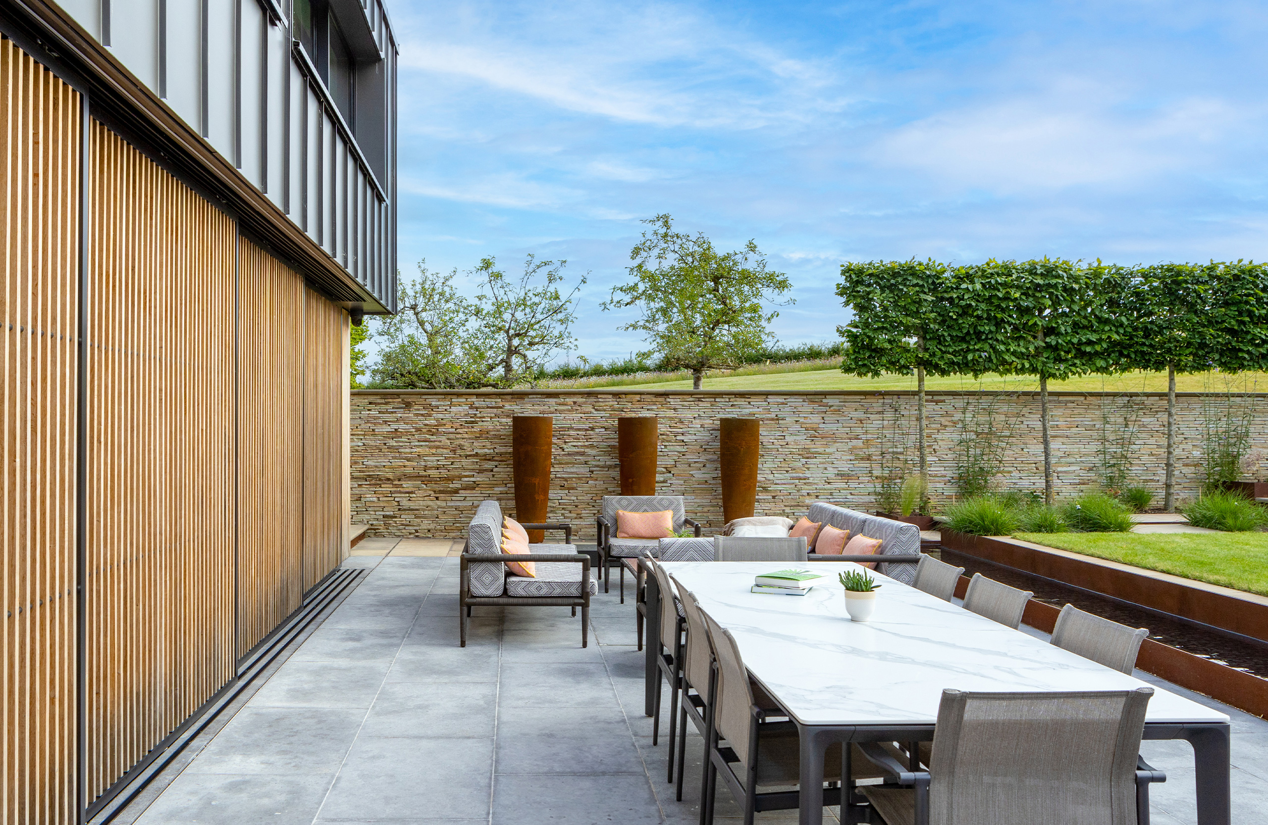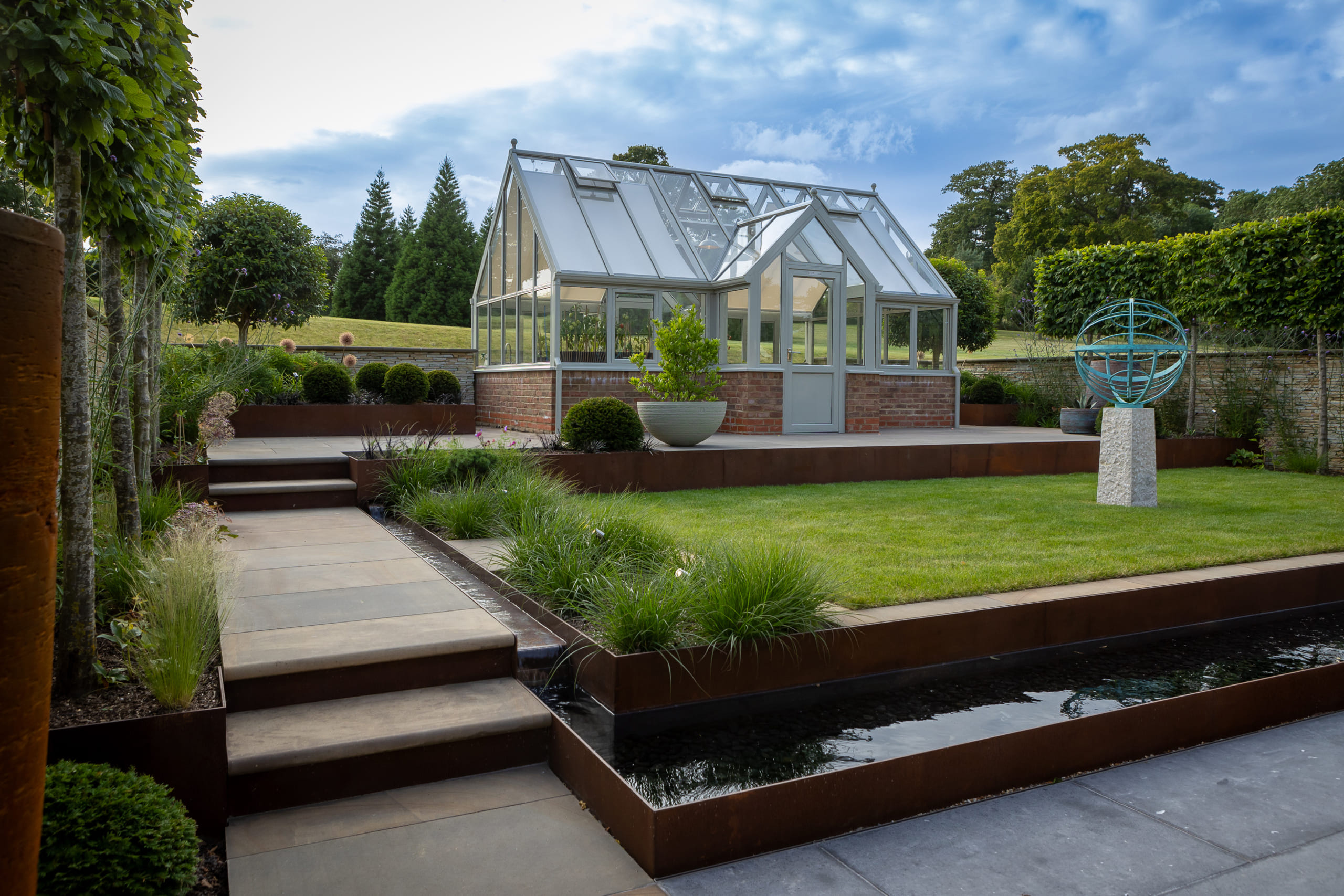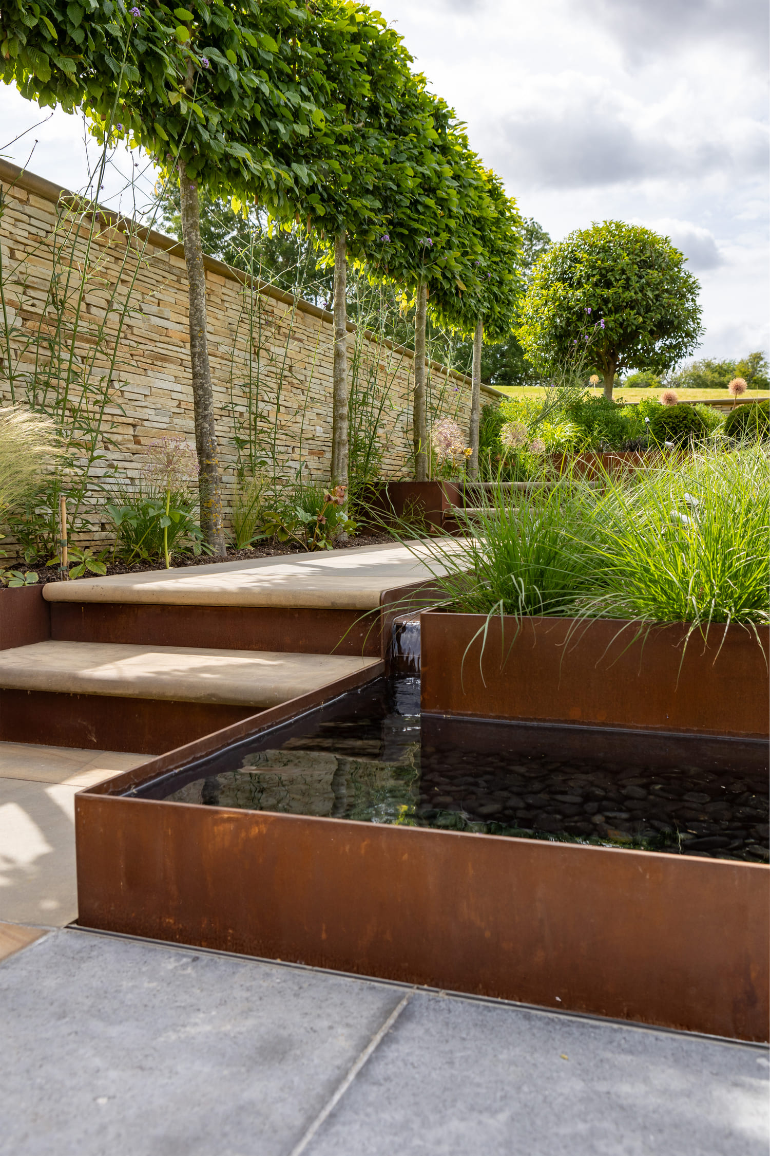 The materials in the design were carefully selected to complement the architectural language of the property, with paddlestone walls helping to define the space and corten steel elements adding a contemporary touch.