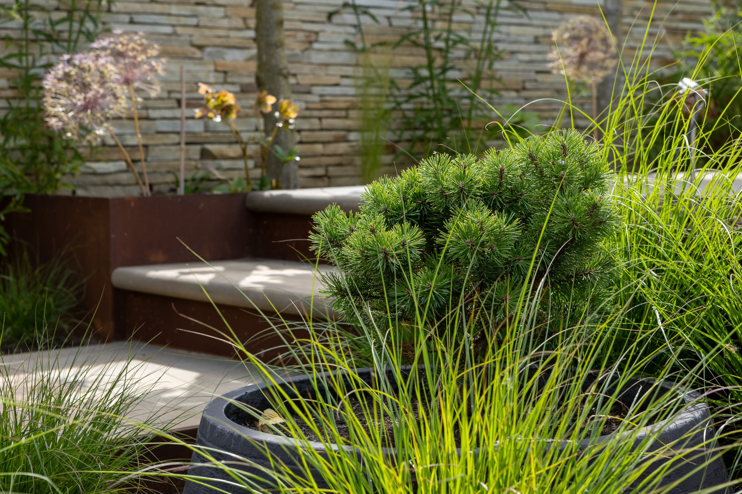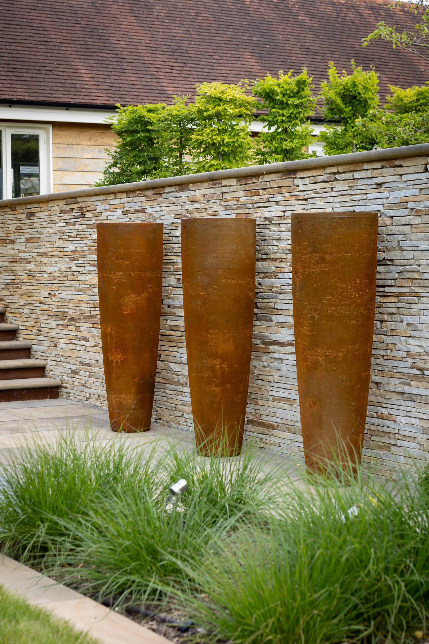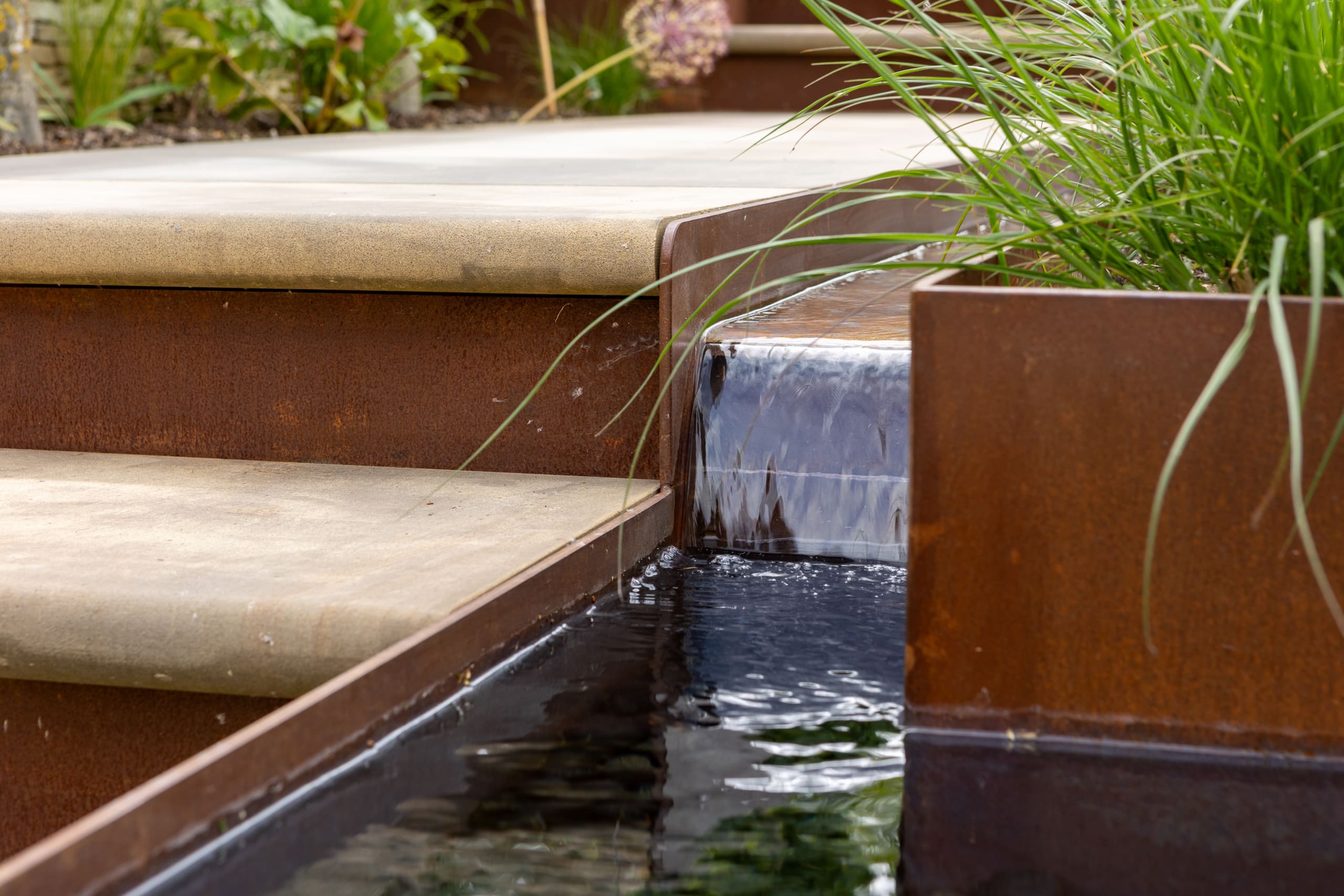 The materials in the design were carefully selected to complement the architectural language of the property, with paddlestone walls helping to define the space and corten steel elements adding a contemporary touch.