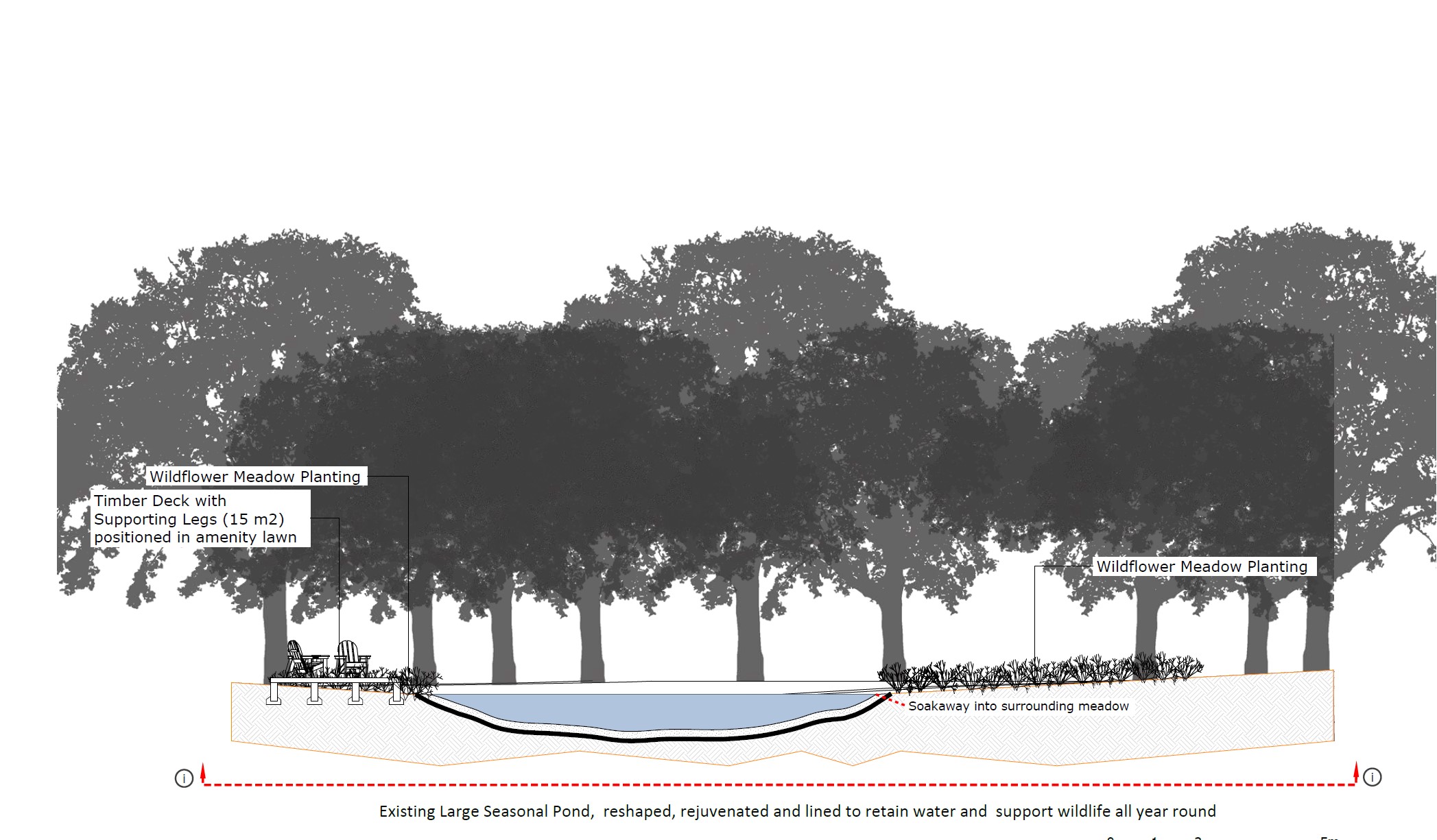 We were thrilled to devise the scheme, designing a meadow, meandering paths through the woodland, and a natural wildlife pond transformed from an uncovered old clay pit.