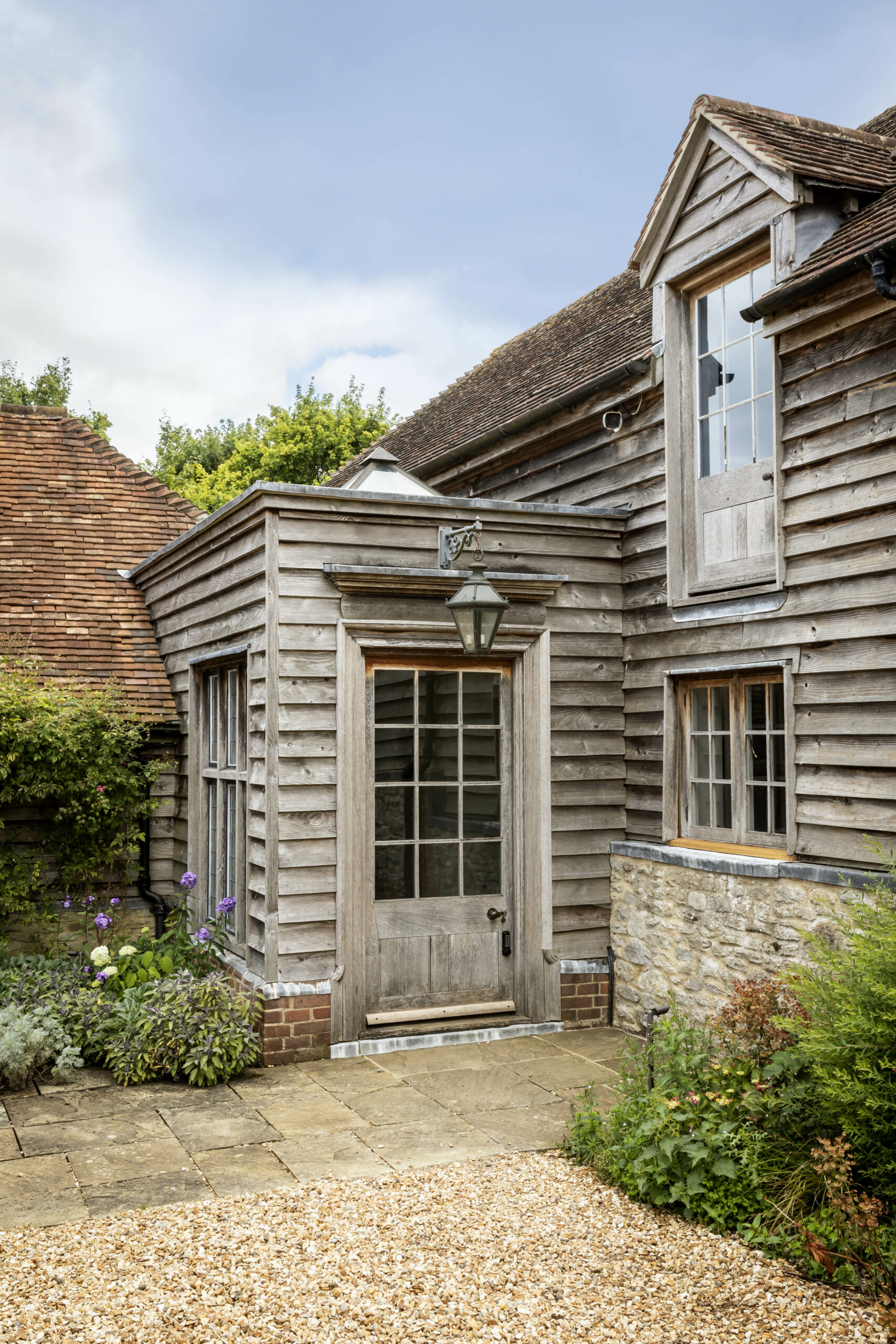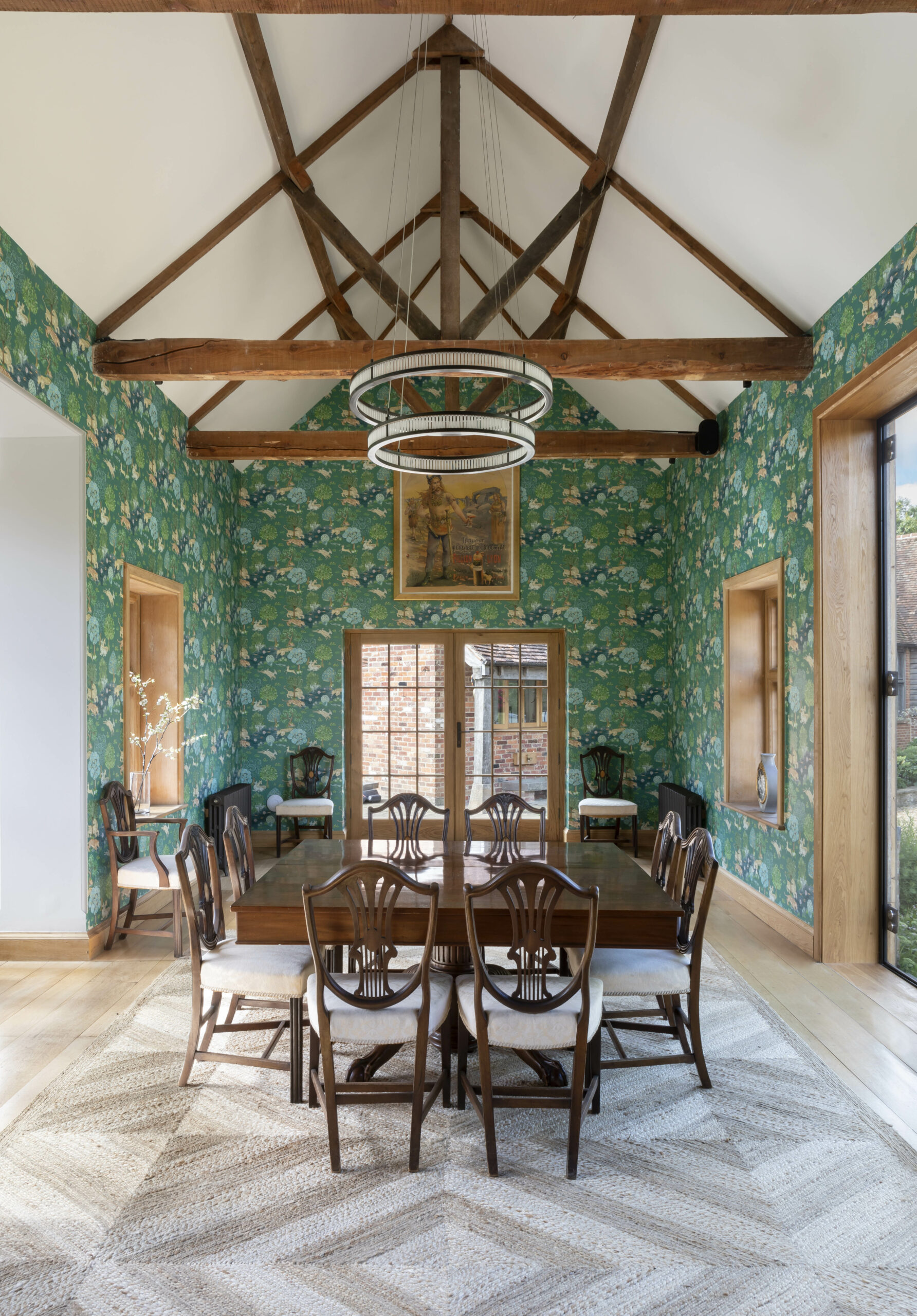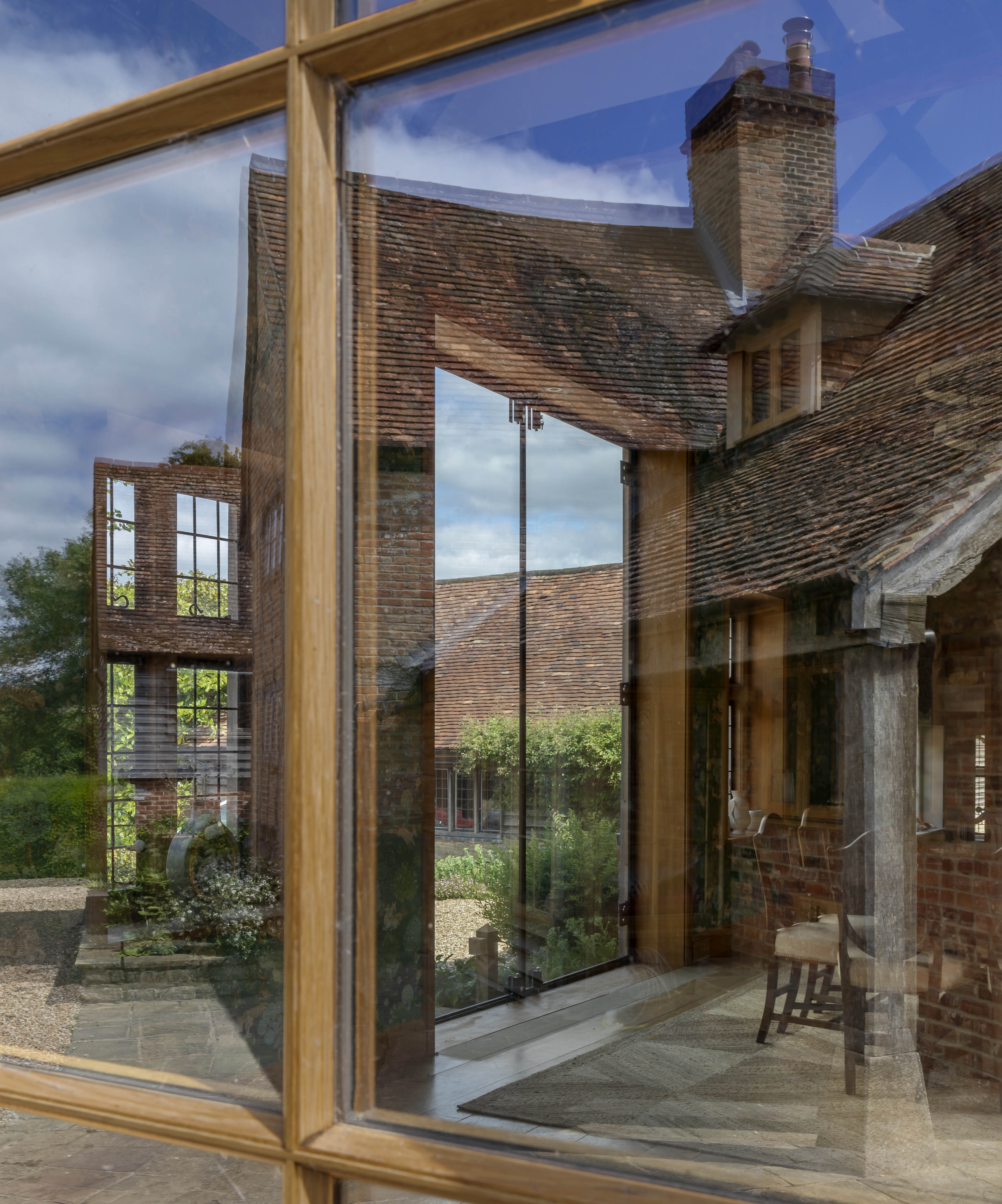 In the Barn, the ceilings were again vaulted and the ground floor spaces reconfigured for entertaining, with guest accommodation above. New lightweight glazing to the existing oak barn doors now provide masses of light and connection to the courtyard, and are able to be opened up in summer when hosting social gatherings.