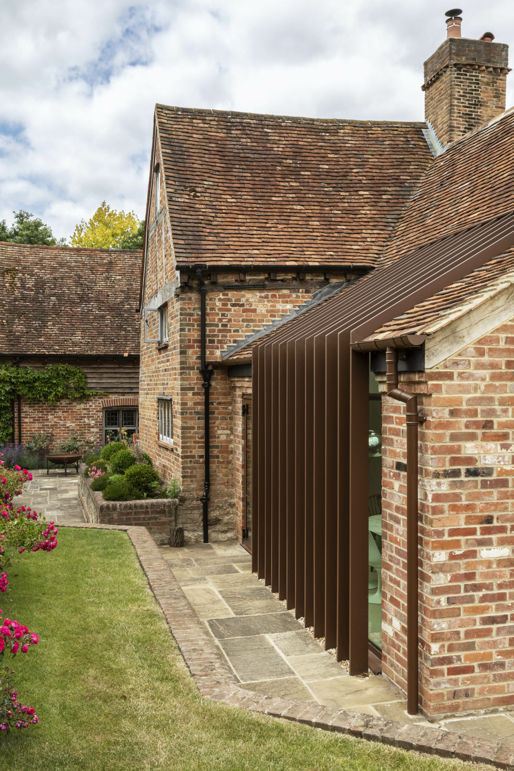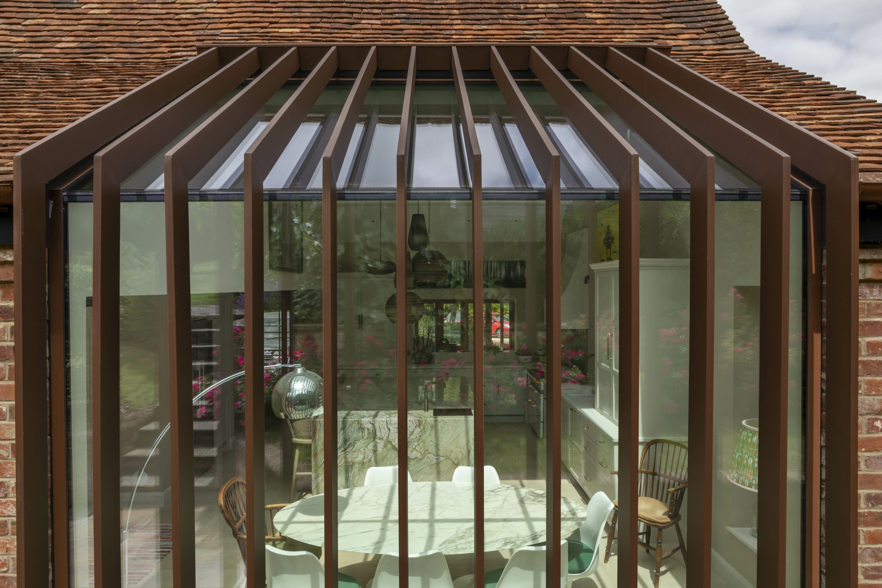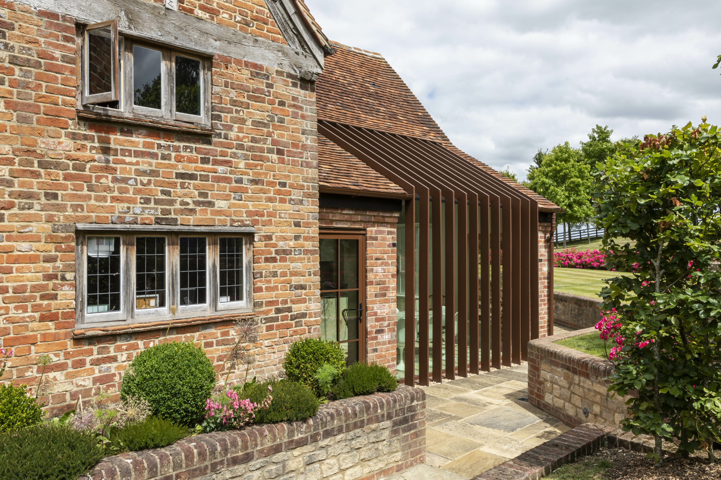 The kitchen has been transformed by a relatively modest 7m2 extension, with the ceiling vaulted into the small bedroom space above (this bedroom was moved) – creating a wonderfully light, double-height room. Glazing covers the new extension elevation and up into half of the pitched roof, with Corten fins providing an elegant architectural statement to emphasise the height of the room and provide solar shading in the day. These rustic fins blend well with the original brick whilst still a pleasing contemporary intervention, based on similar concept design to John Pawson’s Sackler Bridge in Kew Gardens, and Coventry Cathedral. Reclaimed bricks and oak were carefully sourced to integrate with the existing house.