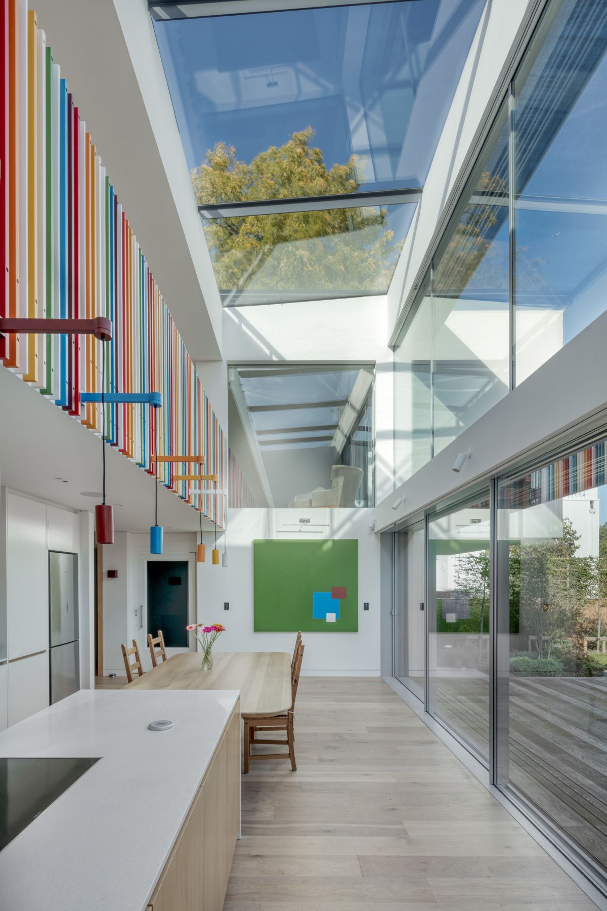 Keeping the house comfortable whatever the weather was crucial to this design, which is why the full-height windows at the back of the house are fitted with timber shutters that can be closed on hot days to provide shade. The house is highly insulated, but a mechanical ventilation with heat recovery system means it never feels stuffy.