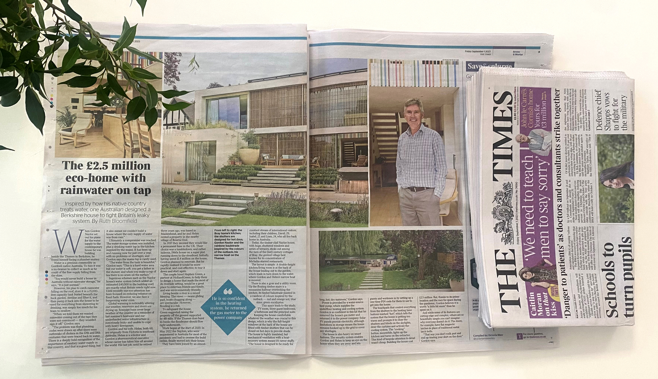 Award-winning property journalist Ruth Bloomfield covers the story of Water’s Edge in The Times, writing “… how this Berkshire house harvests and reuses its own rainwater… ingenious schemes such as this are exactly what Britain needs right now.”