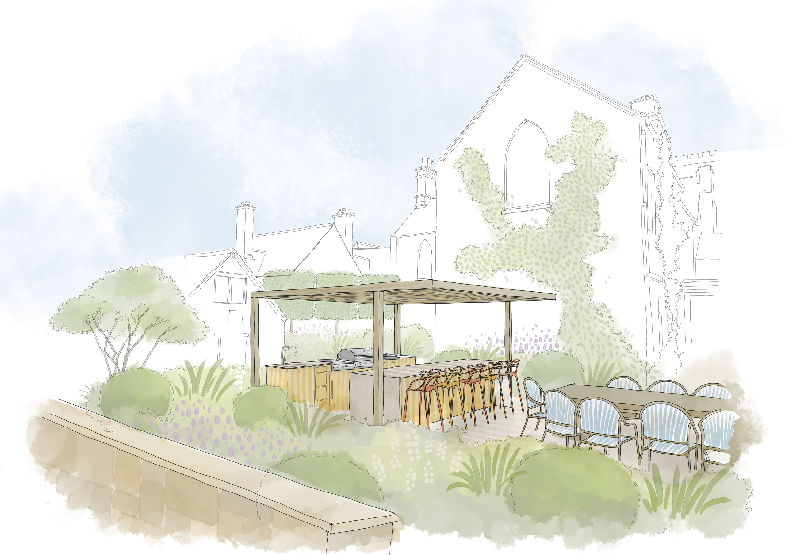 Projects set within a historic context demand particular sensitivity. At Woodacre House, the garden sits directly beside a historic church, whose elevated position required careful consideration of views into the property. To address this, we introduced a layered strategy for privacy: pleached hornbeams and a timber pergola provide discreet screening to the dining terrace without compromising natural light or a sense of openness.