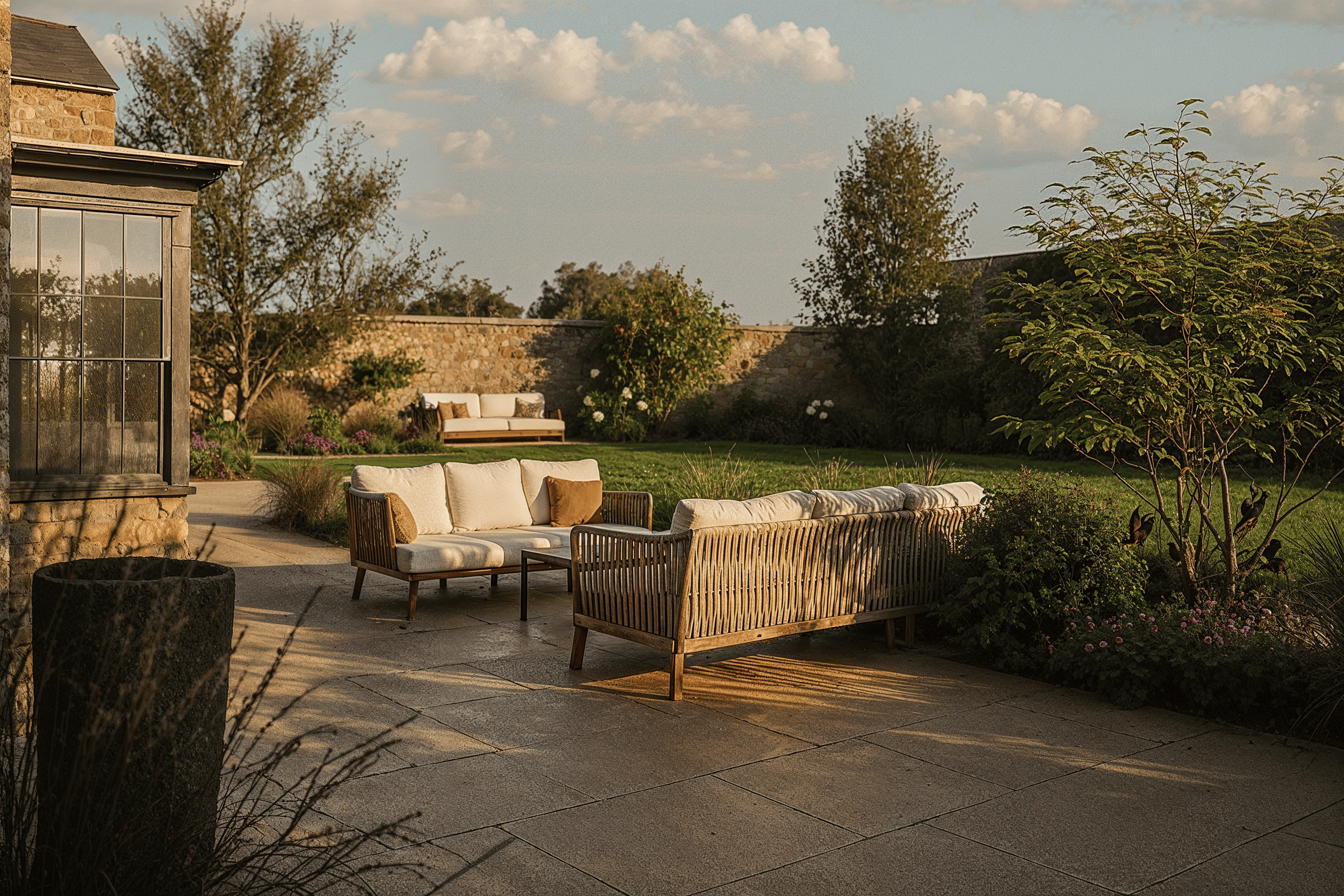 The hot tub terrace sits nearby, yet feels intentionally separate. Slightly sunken and surrounded by textural planting, it is visually and physically removed from the main entertaining area—creating a private, tranquil retreat. Together, these zones offer flexibility for family life, quiet moments, and relaxed hosting, all unified by a thoughtful material palette and gentle transitions.