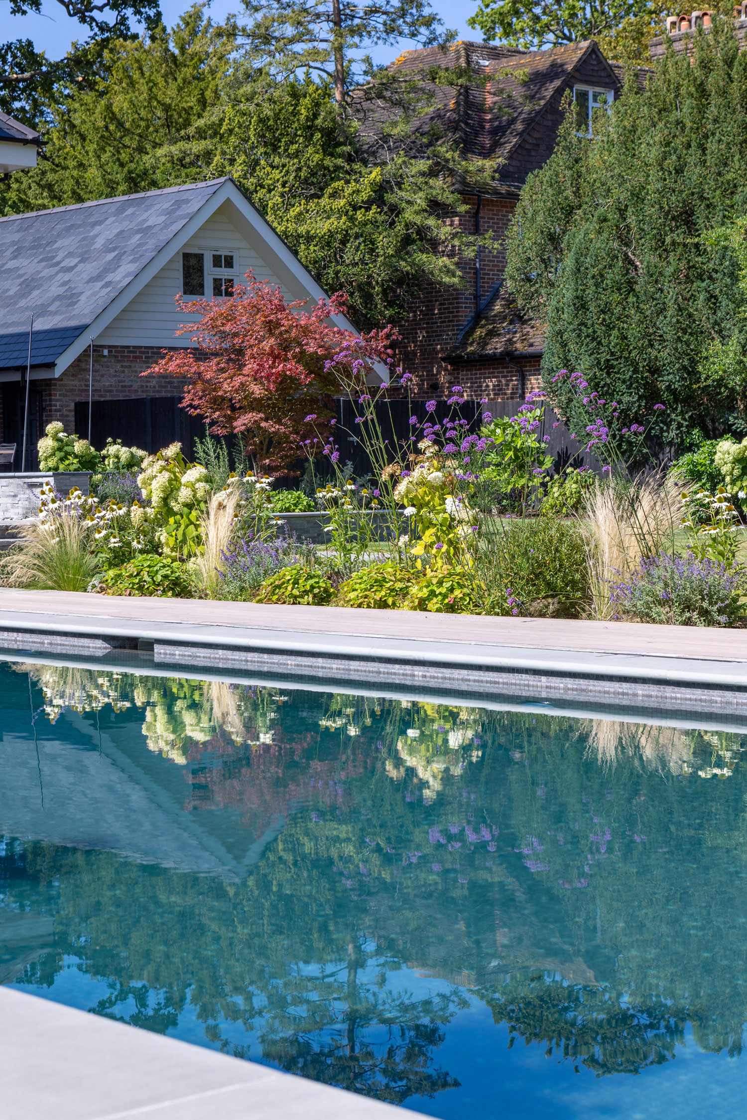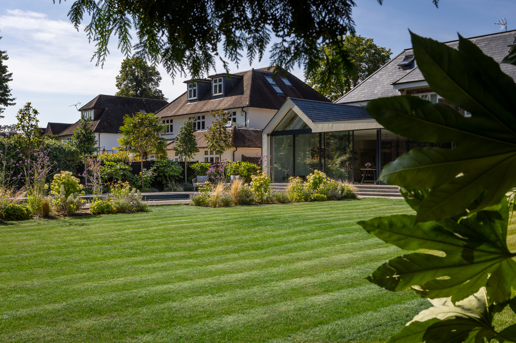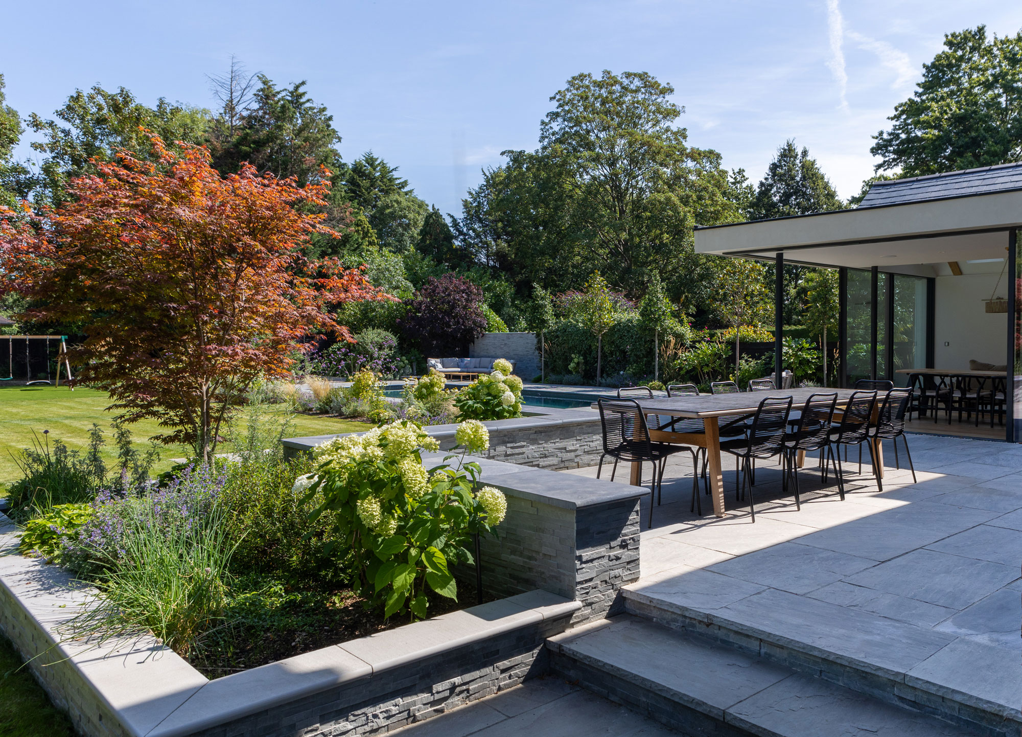 This London family-home garden has evolved from plain lawn to luxurious contemporary landscape, with new patio, dining areas, swimming pool and seating surrounds and decking to enjoy the 360 garden views.