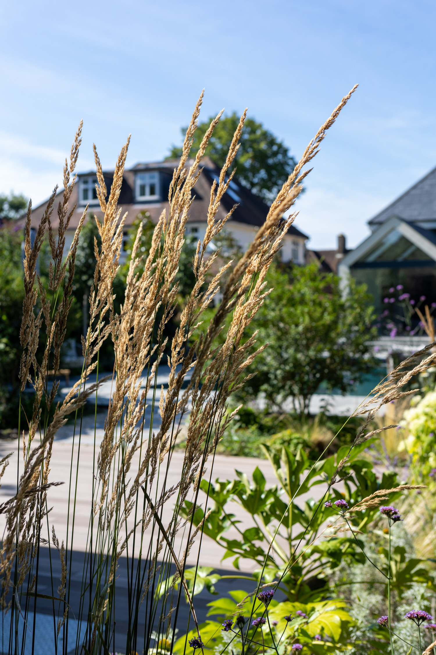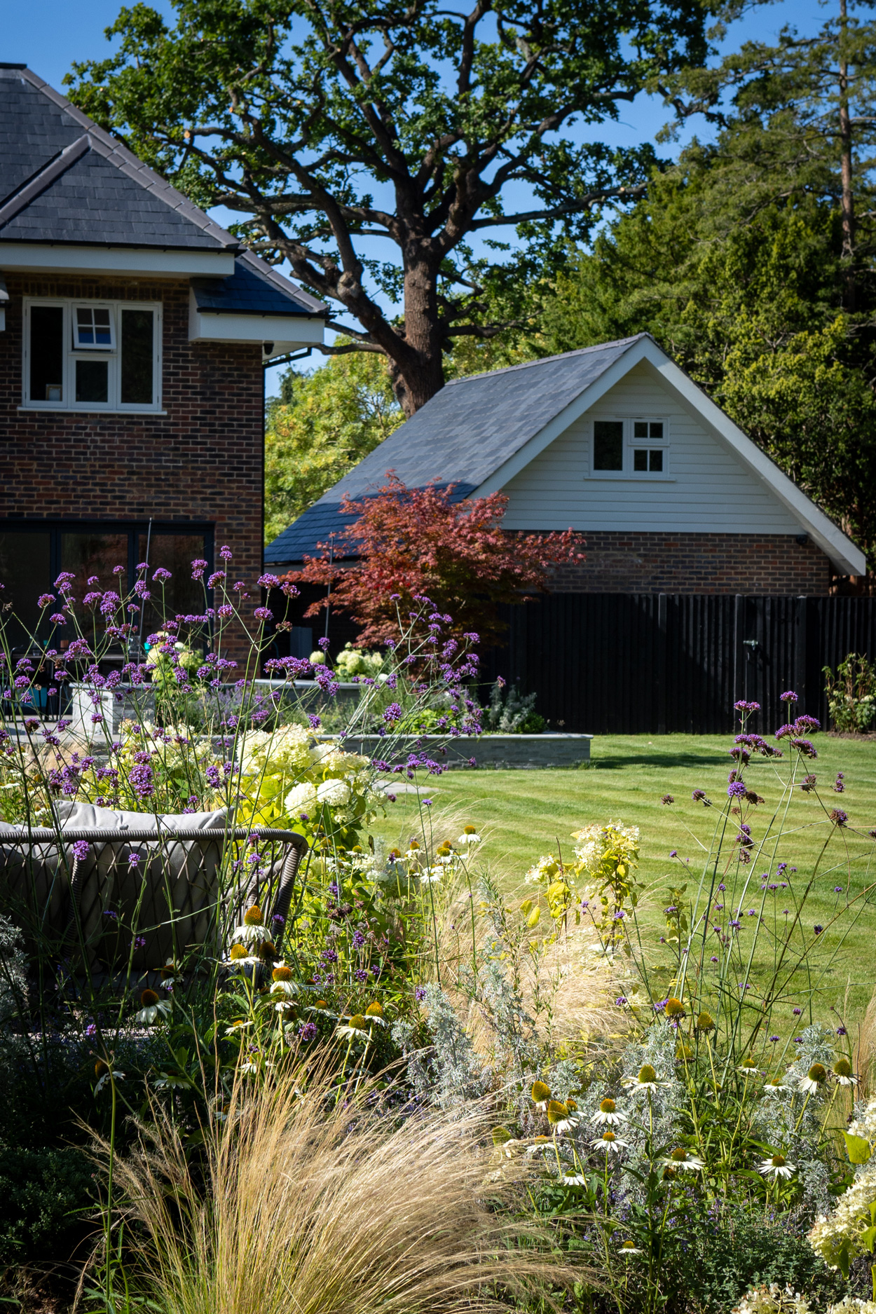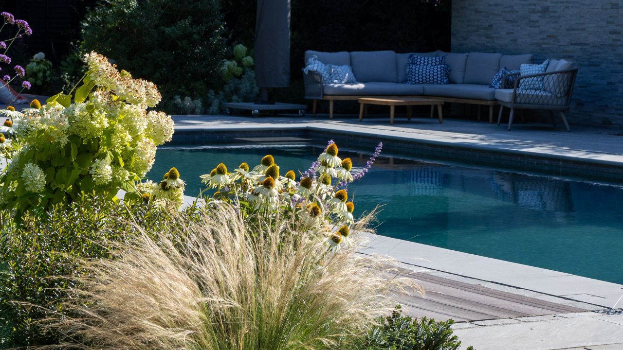 This London family-home garden has evolved from plain lawn to luxurious contemporary landscape, with new patio, dining areas, swimming pool and seating surrounds and decking to enjoy the 360 garden views.