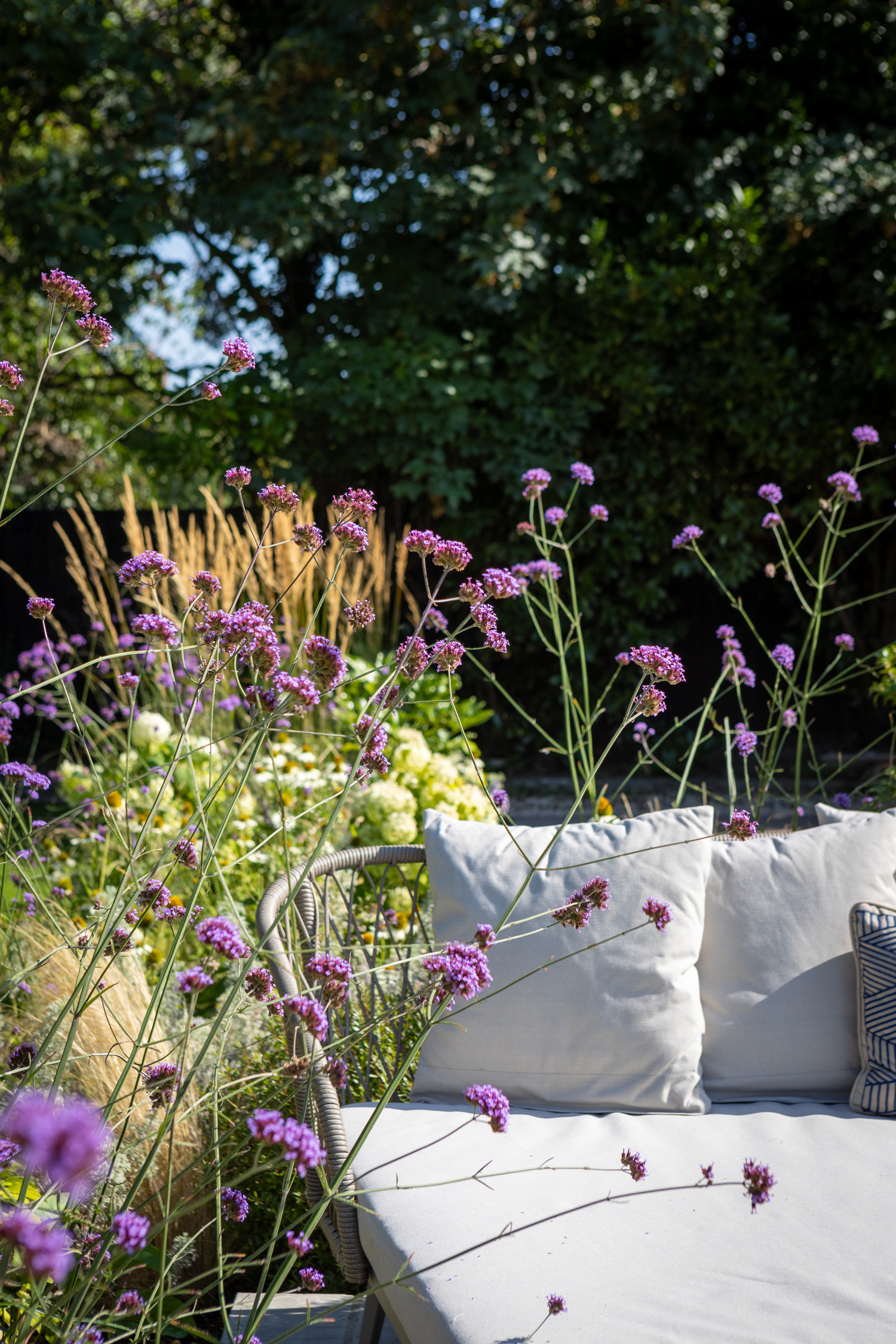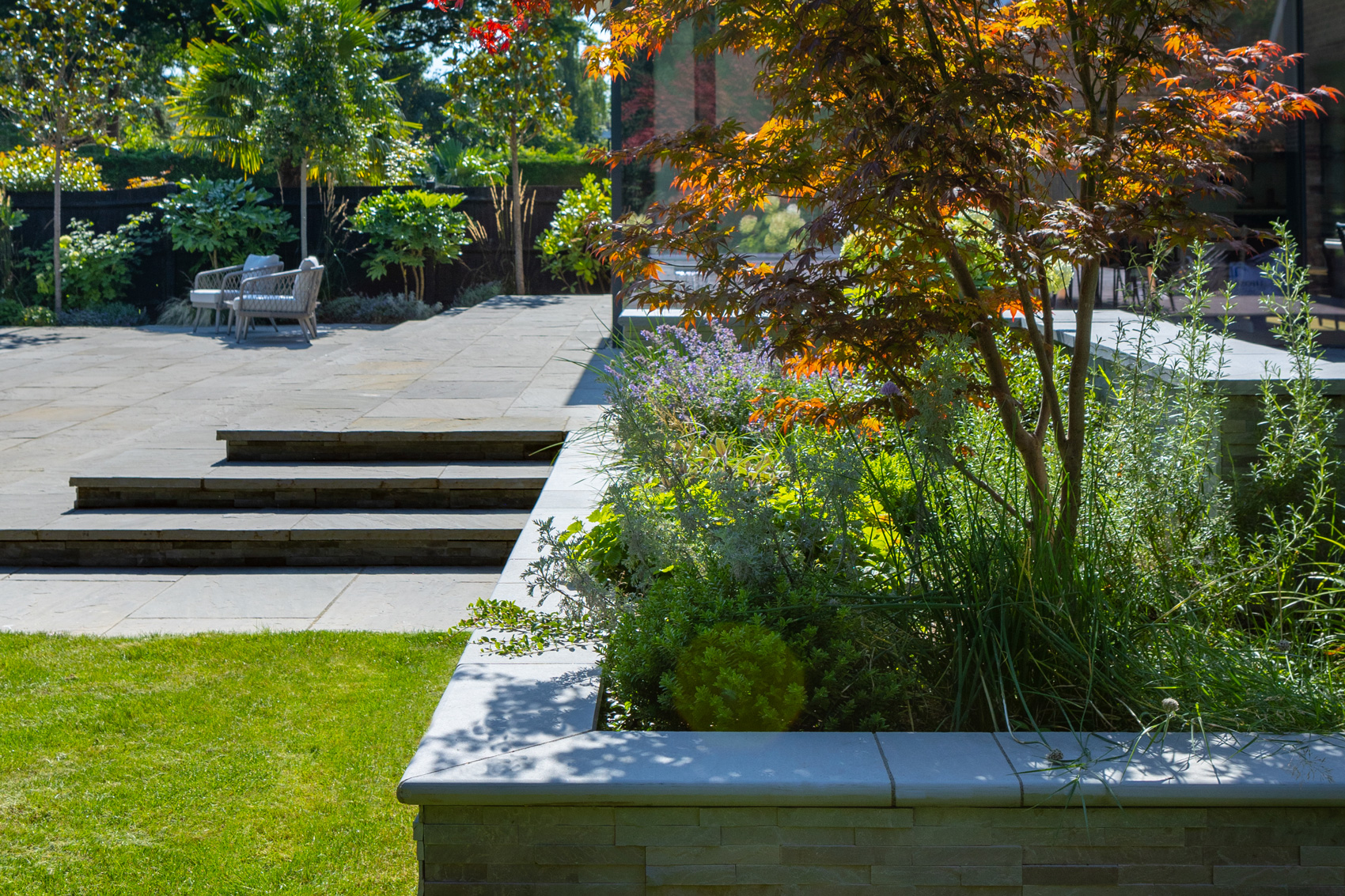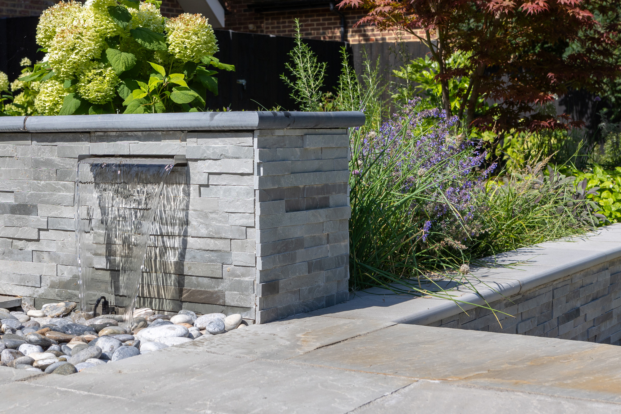 A water feature has been installed beside the dining area, giving a sensory experience gently heard whilst enjoying the garden.