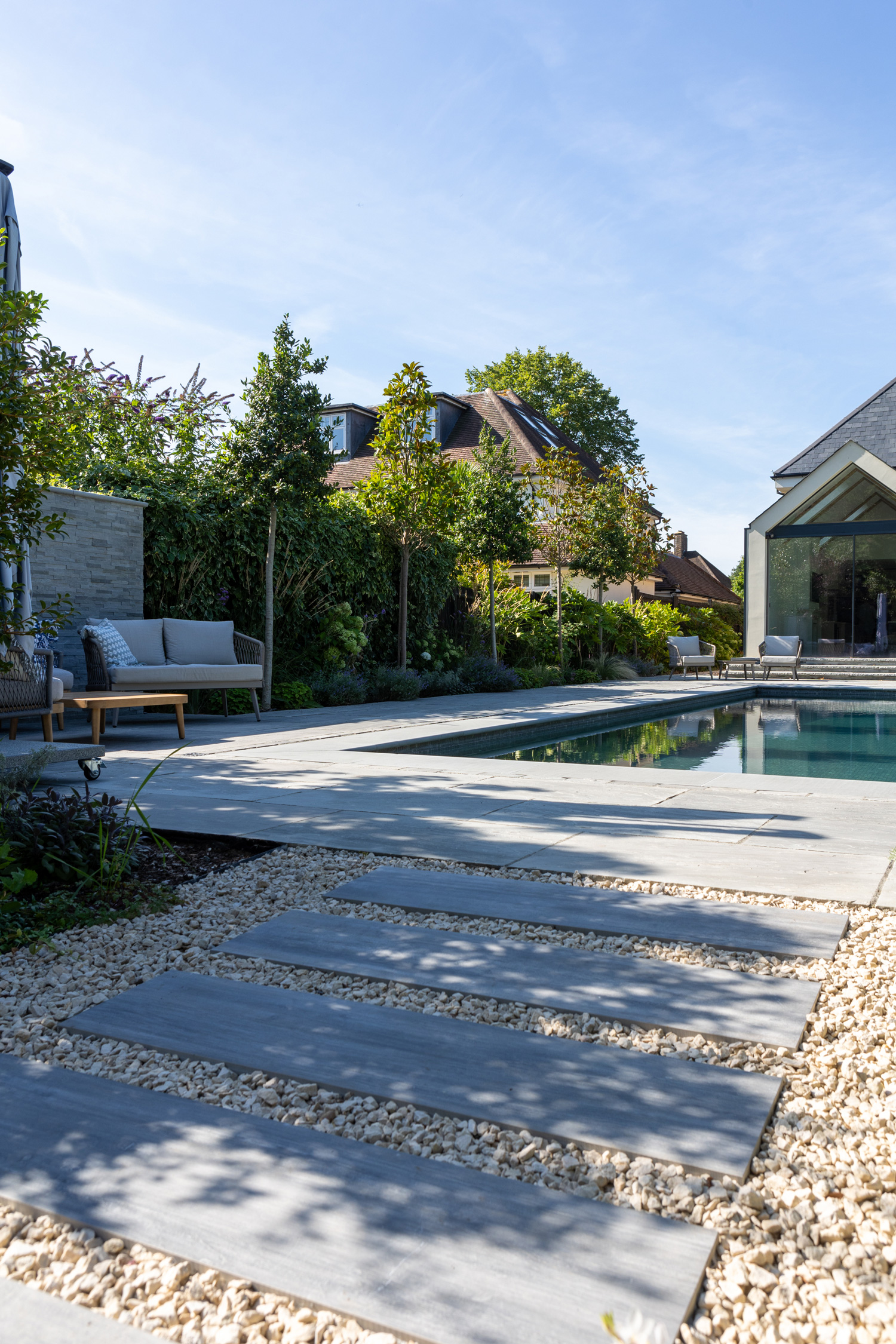 Encircling the pool are several relaxation spaces to suit the light and time of day. We placed pockets of lush greenery amongst them, creating a harmonious blend between the contemporary stone and soft planting.