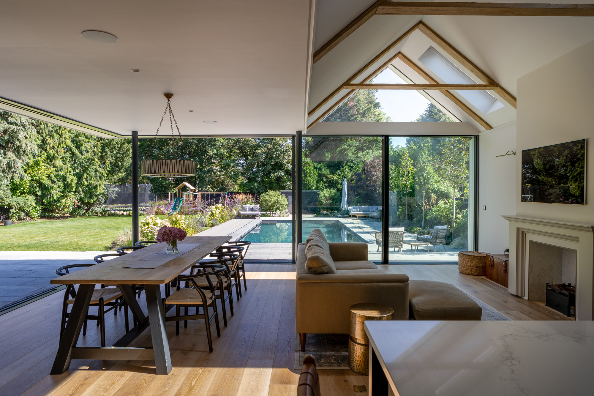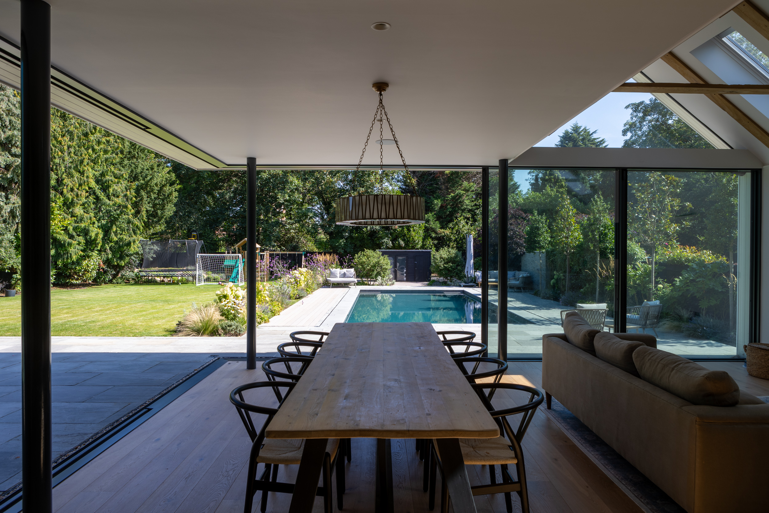 The glazed sliding doors from the kitchen-family room create an easy indoor-outdoor connection, and the patio area with lighting serves as a versatile space for year-round relaxation and socialising, overlooking lovely views of the pool, shrubbery and lawn.
