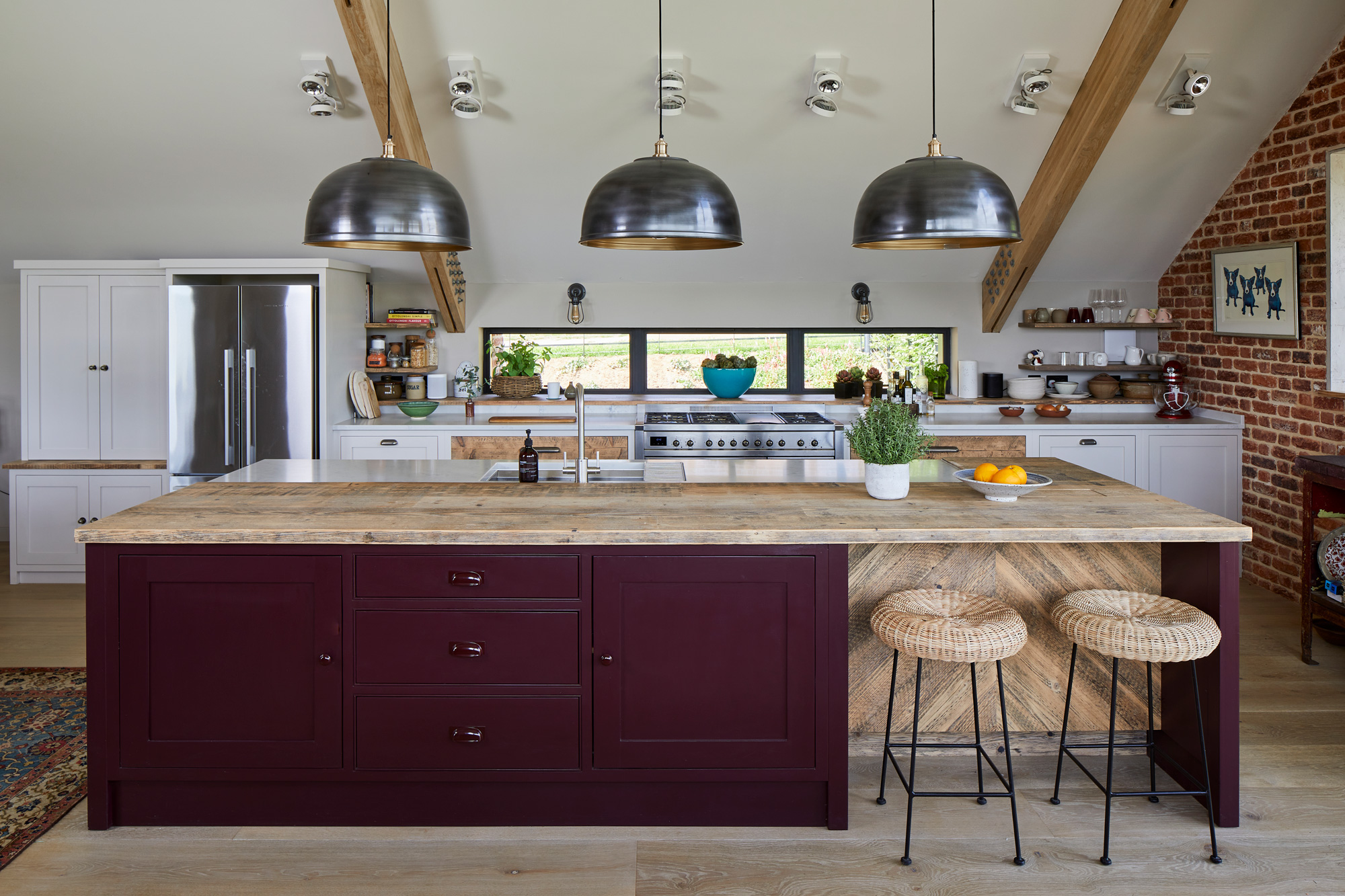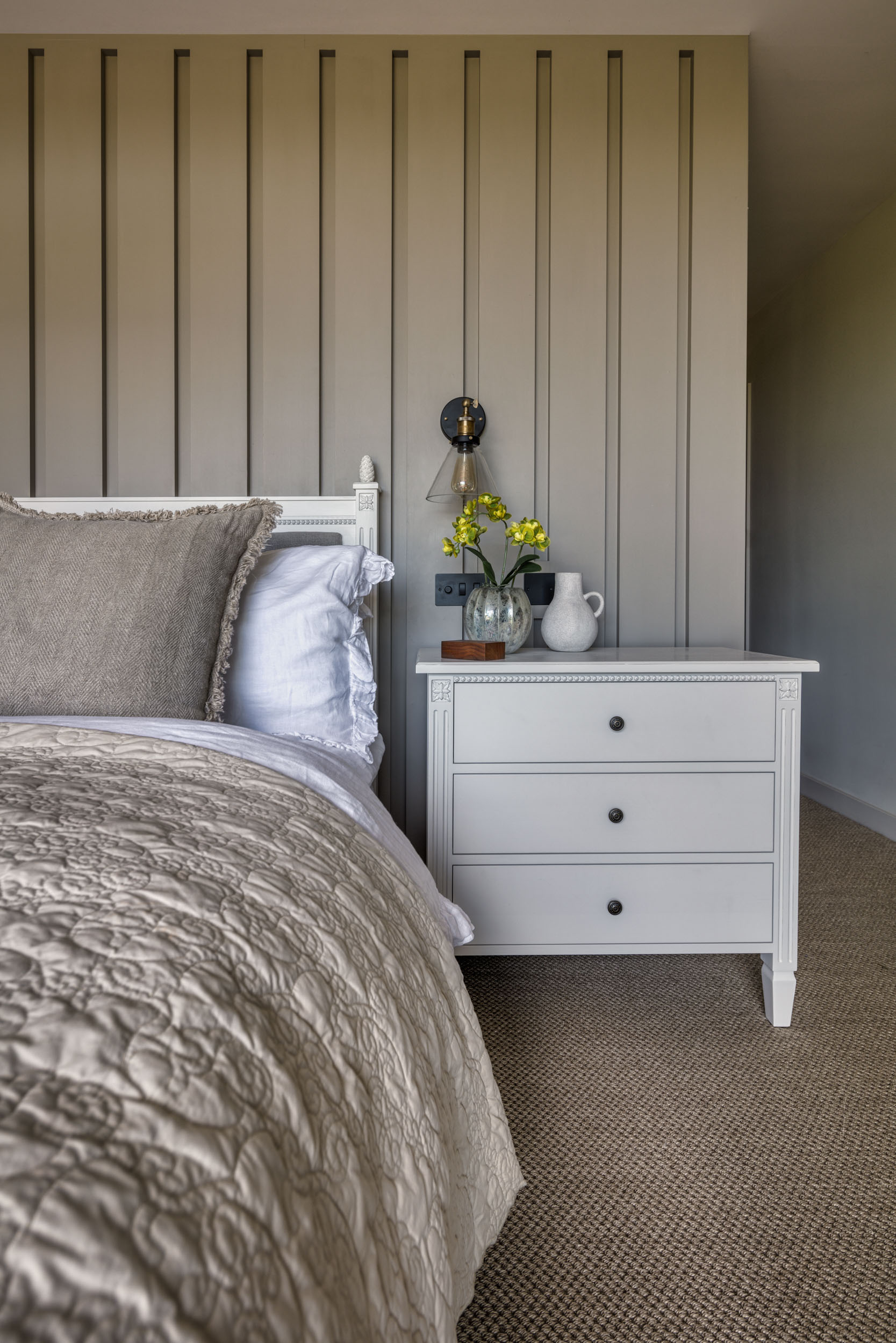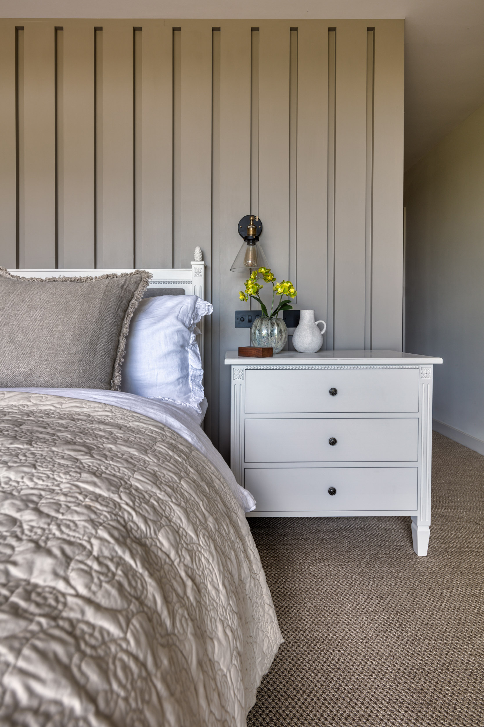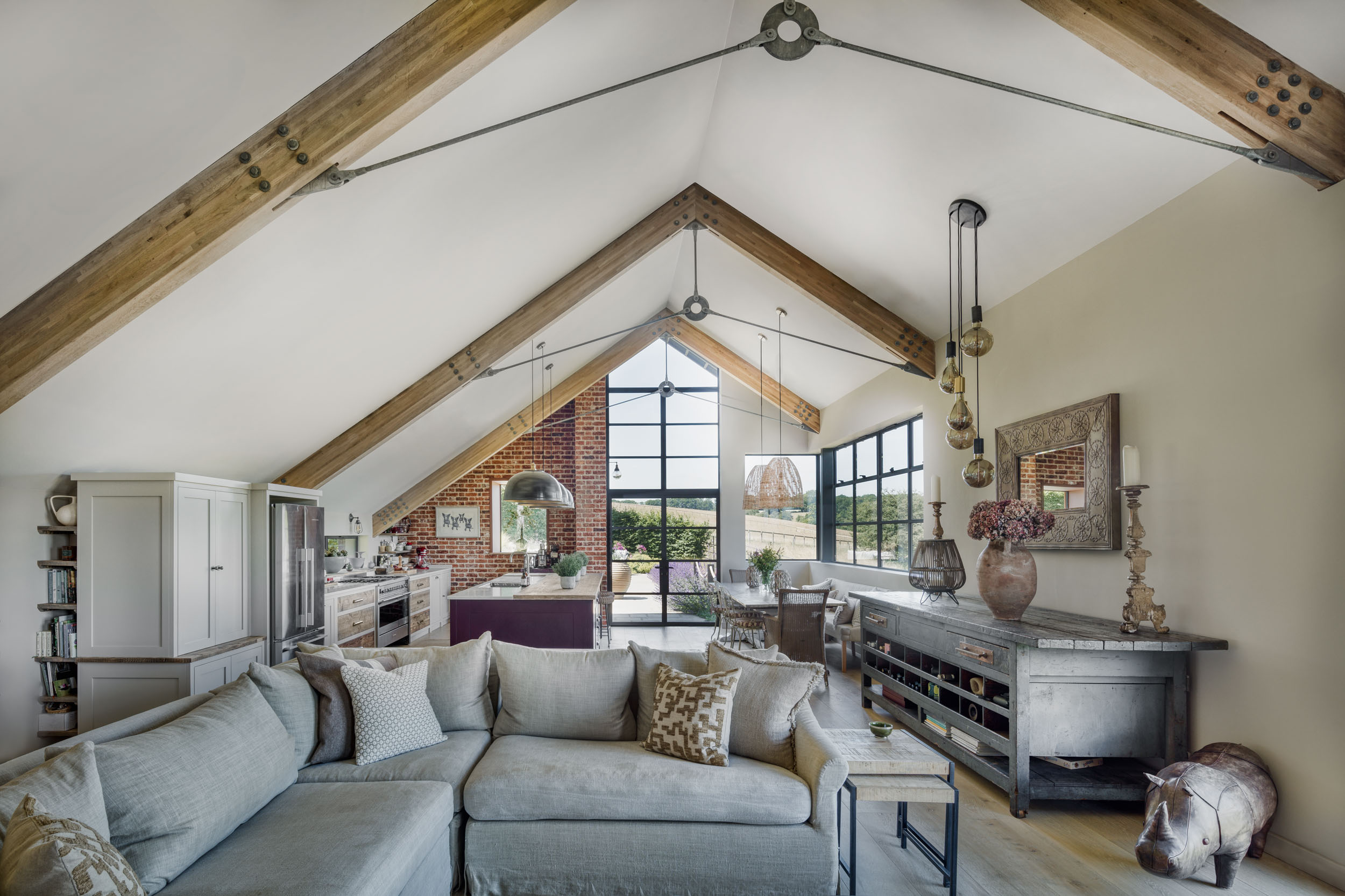 Reclaimed materials were integrated throughout the design. In the master bedroom, timber panelling gives a sense of depth, texture and character, while in the main living spaces an elegant timber dining table and kitchen cabinetry compliment the exposed roof beams above.