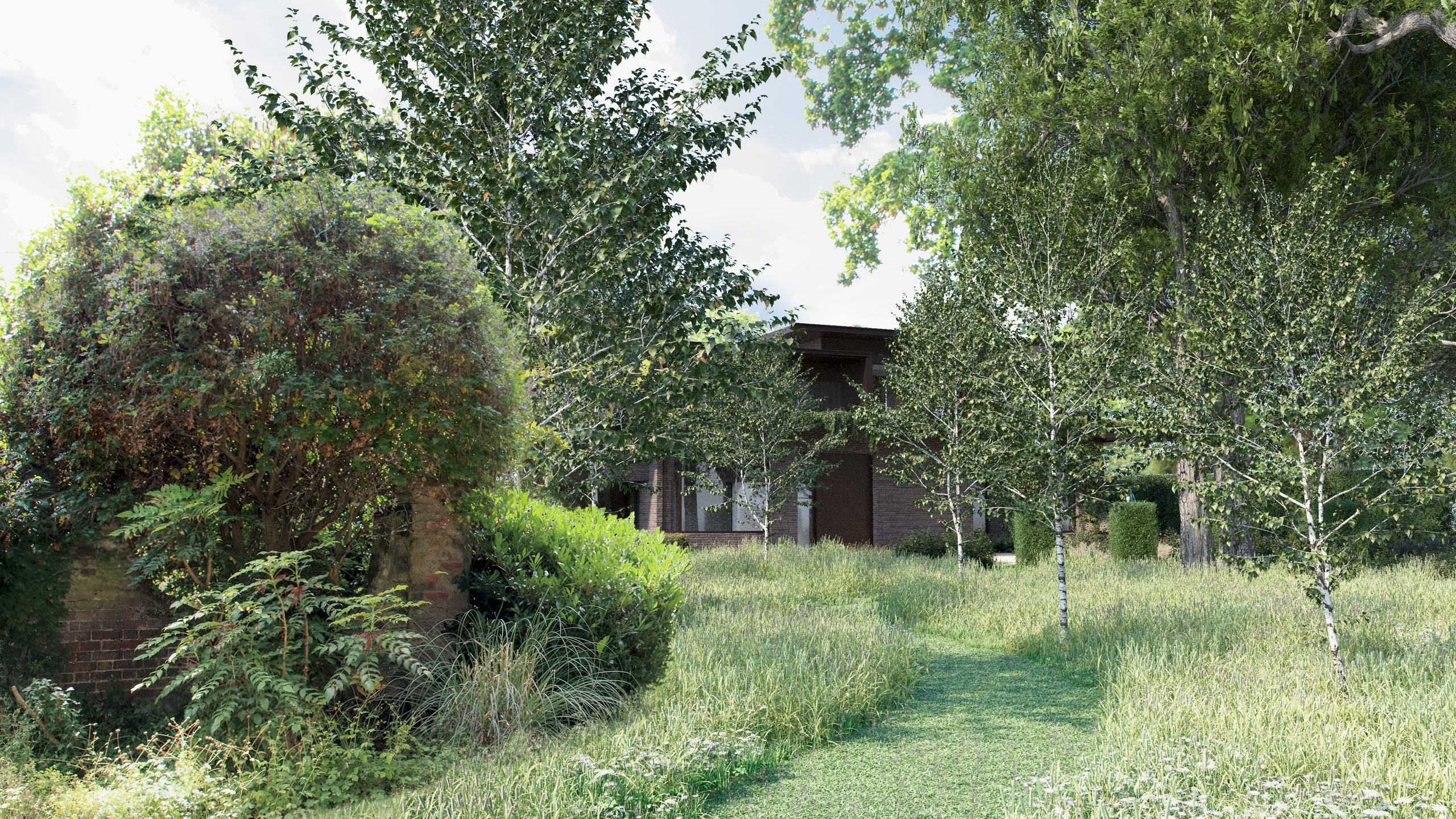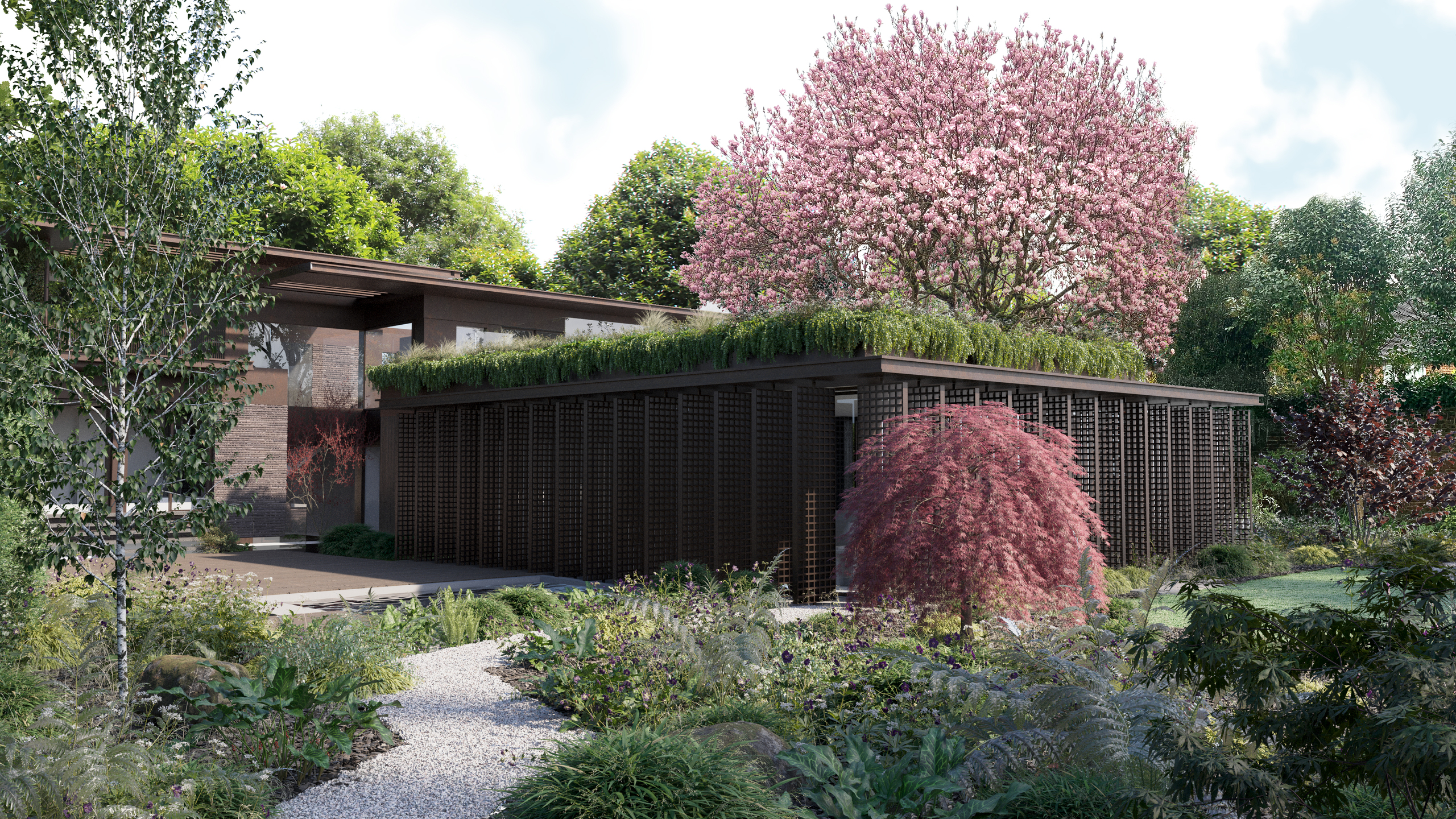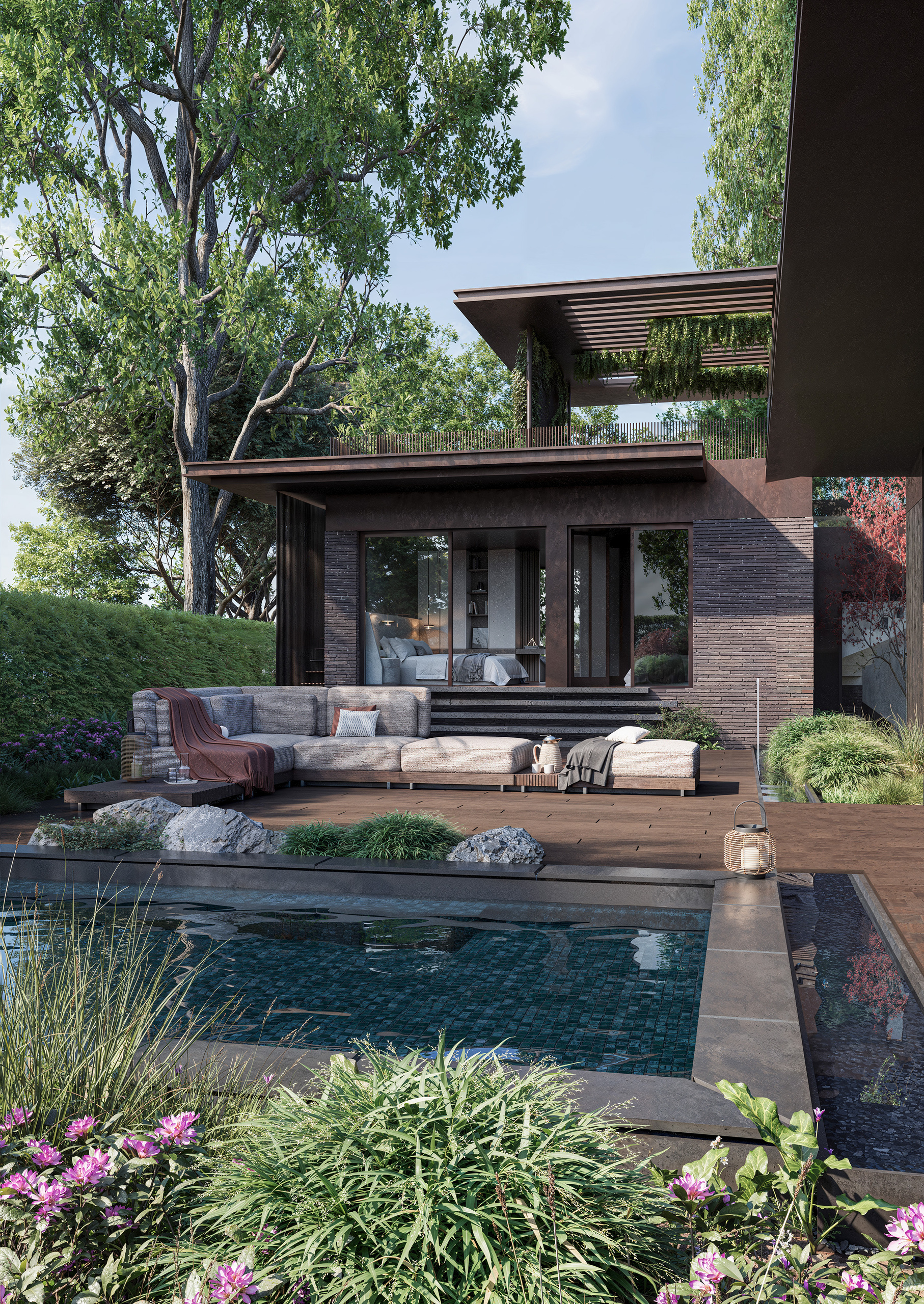 At the heart of the home is an expansive open-plan living, kitchen and dining area that flows effortlessly into the rear garden. Simple, yet intriguing openings spark curiosity, leaving you eager to discover what lies within. An outdoor terrace and pond create a seamless extension of the indoor space, with water appearing to flow directly from the building.